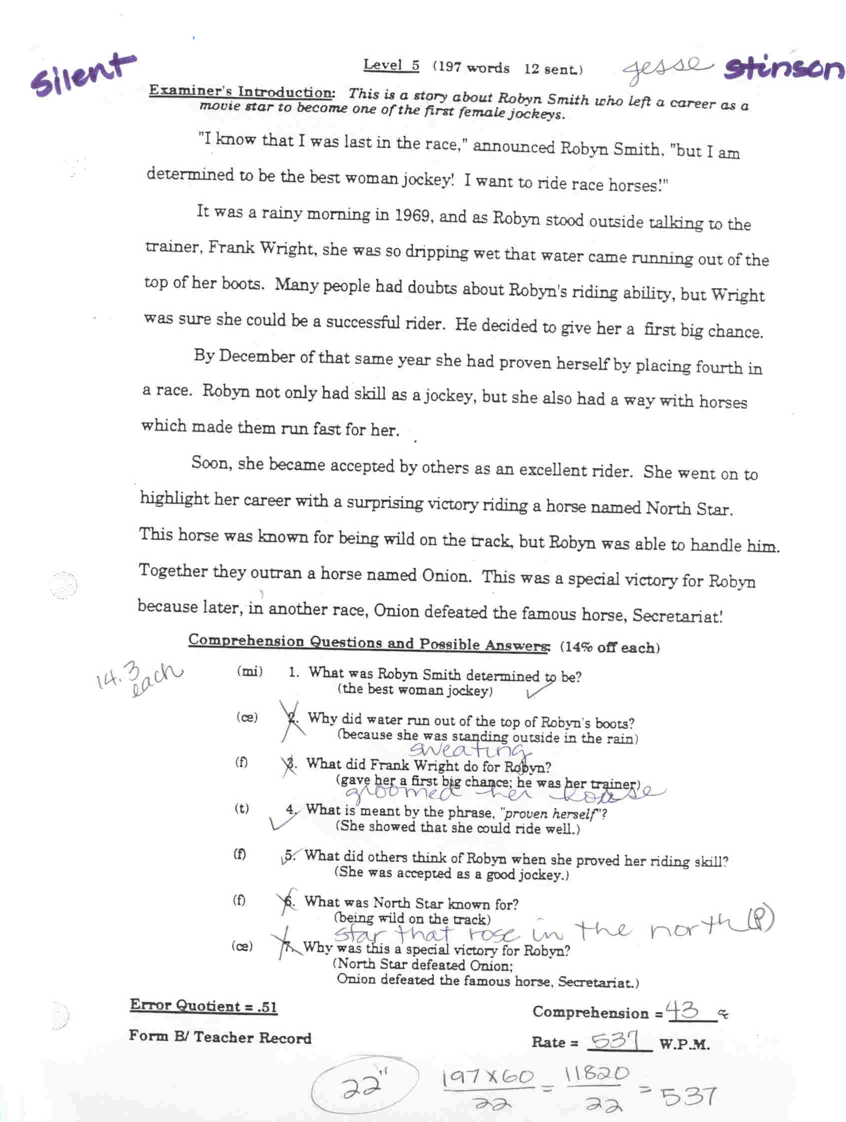 Artifact #4: Reading Assessment This artifact consists of several reading assessments. These assessments were used to develop reading instruction that best fit the reading ability of the student. Included in the assessments are a Word Recognition Inventory, Informal Reading Inventory, Schlagal Spelling Assessment, and a Writing Assessment. Context: This artifact was a product of Reading Assessment and Correction. As part of this class, I learned how to perform the assessments, as well as how to interpret the results. Based on the results, I was able to choose appropriate reading materials and develop instruction using strategies to help the student improve fluency, accuracy, and comprehension when reading. This particular assessment was administered to a 10 year old fourth grade student who was a member of my reading group. While an average student, this student lacked accuracy and fluency. This assessment helped me attend to and analyze his specific errors, which helped me learn more about him as a reader. As a result of performing these reading, writing, and spelling assessments, I was better able to effectively meet his academic needs. Alignment: Standard A: Instructional Expertise The candidate demonstrates instructional expertise by applying the theoretical, philosophical, and research bases for educational practice in P-12 settings to improve student learning. By implementing reading, spelling, and writing assessments in my classroom, I am basing instructional decisions on student ability and learning style. Also, materials selected for use reflect the students’ reading ability, as well as interests. Standard B: Knowledge of Learners The candidate incorporates knowledge of the nature of the learner, learning processes, variations in learning abilities and learning styles, and strategies for evaluating learning into the planning, delivery, and evaluation of instruction. By utilizing these assessments, I strive to identify the strengths and weaknesses of my students, and plan instruction accordingly. I am reflective in designing instruction in that my instruction is modified to encourage student success. Students experience success because they are given materials to work with that are developmentally appropriate for them. My instruction is adjusted to meet their needs. Students also work one-on-one with me, in small groups, and as a whole group. Standard C: Research The candidate uses research to examine and improve instructional effectiveness and student achievement. The process of administering these assessments provides me with valuable information that can be used to improve student learning, as well as develop classroom practices that enhance student learning. Alternative strategies can be found by turning to current research.