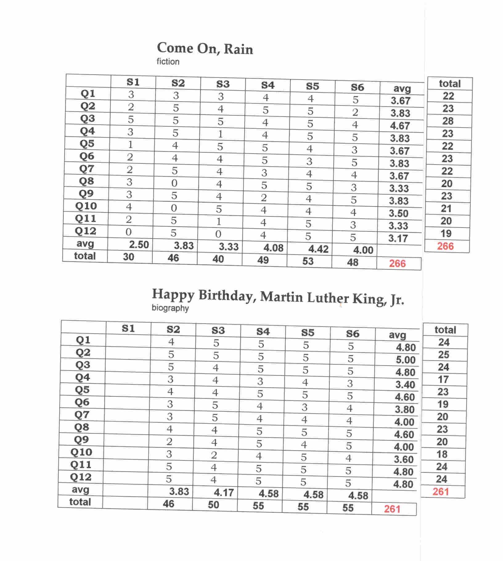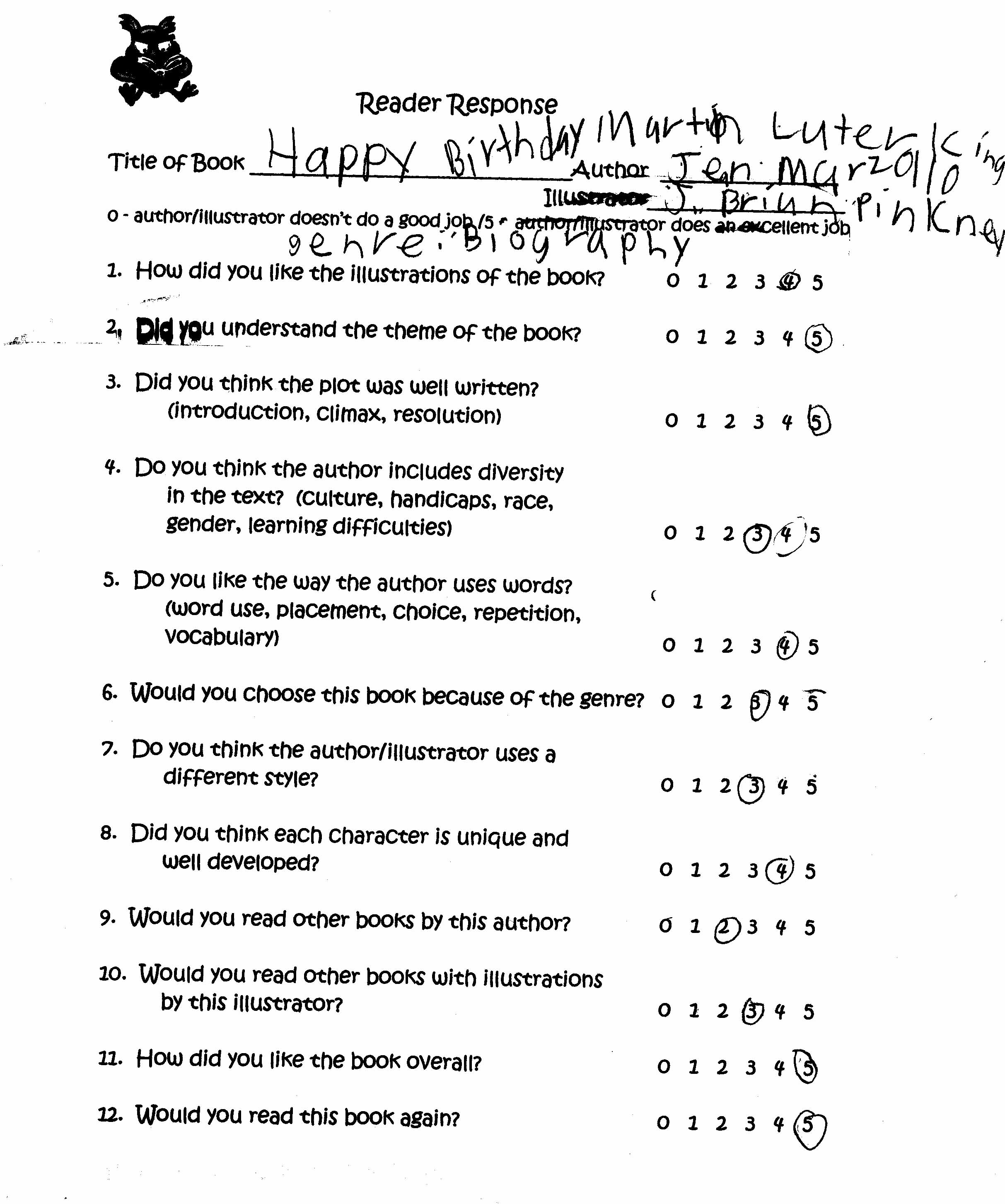 Artifact #5: Reader Response Project This artifact contains a Reader Response Project that was completed to discover what type of literature my students most enjoyed. By being aware of their interests, I can better choose materials to meet their academic needs, as well as appeal to their personal interests. Context: This artifact, which was a product of Advanced Children’s Literature, is a Reader Response Study that involved sharing five books with my students. Because the class focused on literature, one of the goals was to educate teachers of the different types of print and formats currently available to children. The books included an online book, a tall tale, a fictional narrative, a biography, and an electronic book. Students read in partners or listened to the story as a read aloud. After each reading students completed a Reader Response Survey, followed by an informal book talk. The various components of this artifact include a bibliography of books shared with students, a student response survey, and graphs of student ratings. Alignment: Standard B: Knowledge of Learners The candidate incorporates knowledge of the nature of the learner, learning processes, variations in learning abilities and learning styles, and strategies for evaluating learning into the planning, delivery, and evaluation of instruction. Through this Reader Response Study, I attempt to develop a deeper understanding of my students. The group of students chosen for this project is comprised of struggling readers. In order to increase their motivation to read, I learn which genres, topics, literary elements, etc appeal to them. Once this information is obtained, I am able to create a classroom environment in which my students feel welcome and can experience success.